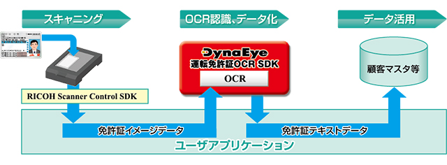 スキャナーからの読み込みは、「RICOH Scanner Control SDK」(注2)を使用し、データ入力に「DynaEye 運転免許証 OCR SDK」を使用します。免許証データをテキストファイル化し、本人確認後に顧客マスタ等に登録します。