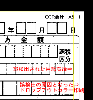 ドロップアウトカラー帳票の書式定義を作成する際には、前記のようにドロップアウトカラー印刷部分もイメージ上で黒く読み取ります。書式定義プログラムでは、黒背景を検出して自動的に用紙のサイズを検知しますが、このとき、帳票の各辺から幅5.08mmの領域に連続した黒(ドロップアウトカラーの線や塗り潰し)があると、用紙サイズを誤検出することがあります(ドロップアウトカラー印刷部分は、帳票認識のときには白く読み取られますので、書式定義時のみ問題になります)。