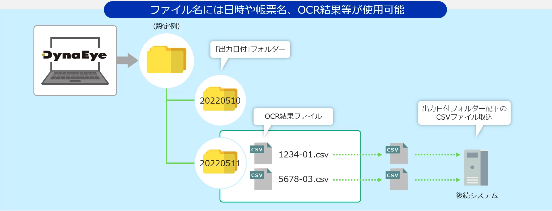 出力フォルダーやファイル名も柔軟に変更可能なので、後続システムを改修せずにデータ取り込みができます。