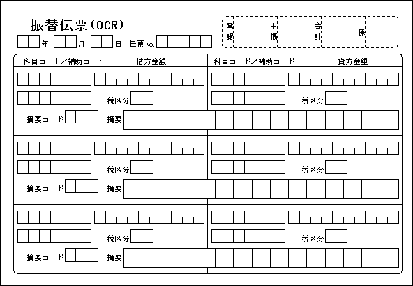 | ポイント | 一般的な振替伝票サンプルです。 お使いの会計パッケージに外部入力があれば、連携が可能です。 摘要欄の漢字読み取りには知識処理を行っていないため、住所・氏名などに比べて認識率は劣ります。 |