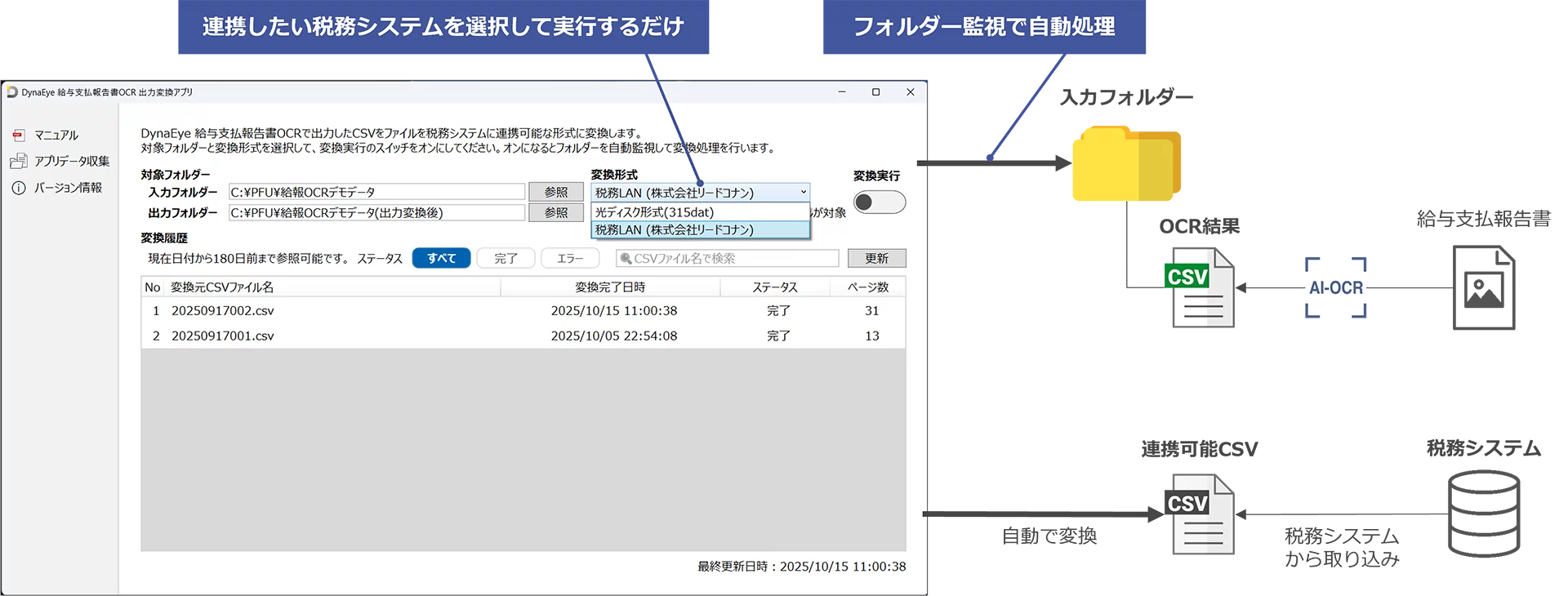 フォルダー監視により自動で変換し、税務システムへの連携をサポートします。