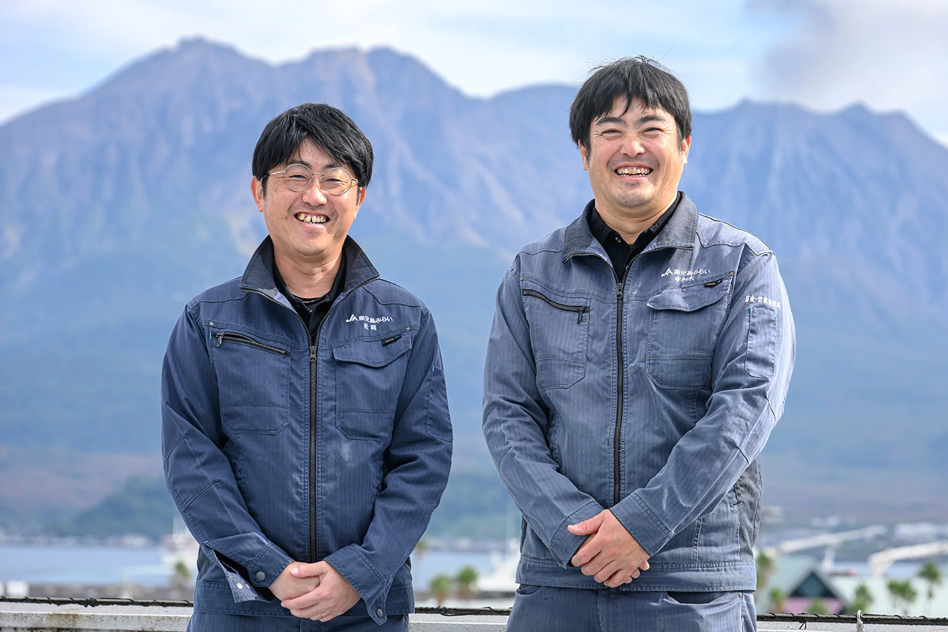 左がJA鹿児島みらい 営農経済部 営農企画課の松岡和昭さん、右が同じく幸加木清寛さん。JA鹿児島みらい屋上にて、桜島をバックに。