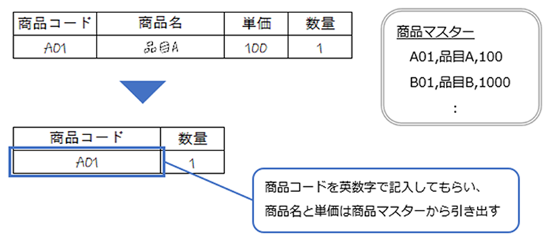 例えば、商品名や摘要など、商品マスターやデータベースから引き出し可能な項目は、漢字で記入するのではなく、できるだけコードを使って記入してもらいマークや英数字中心の読み取りにするのがよいでしょう。
