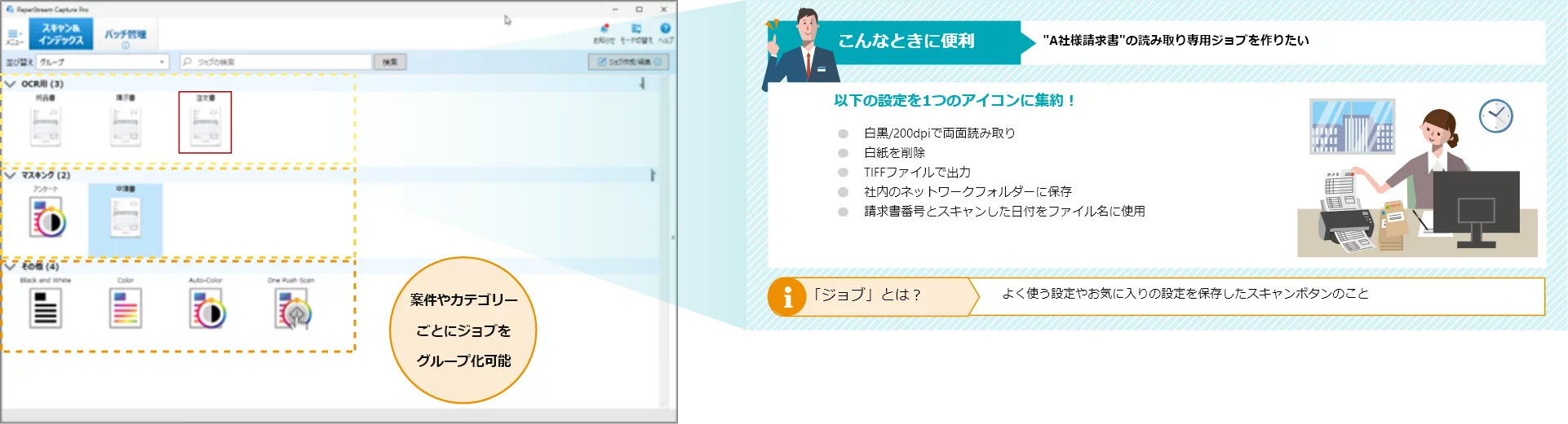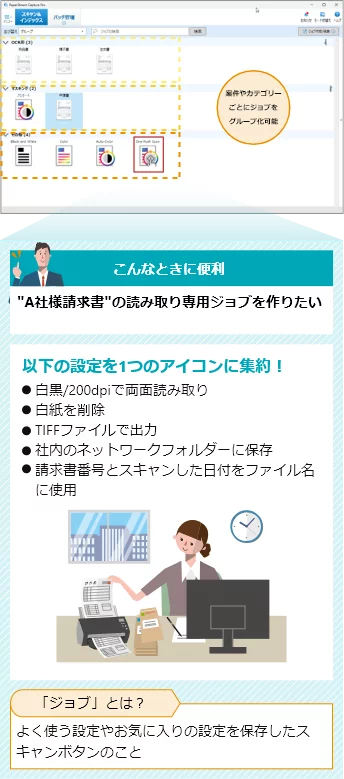 さらに、案件やカテゴリーごとにジョブをグループ化(注1)することで、目的のジョブを素早く見つけることができ、スキャン業務をよりスムーズに行えます。