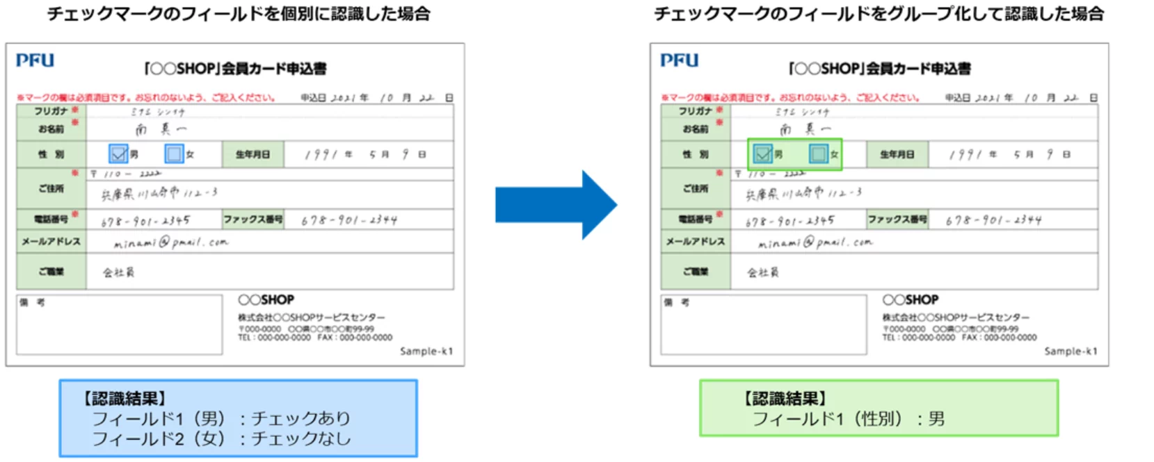 1つの項目に複数の選択肢があるような場合、選択肢のフィールドを1つのフィールドにグループ化することで、認識結果を1つの値にまとめて出力可能です。