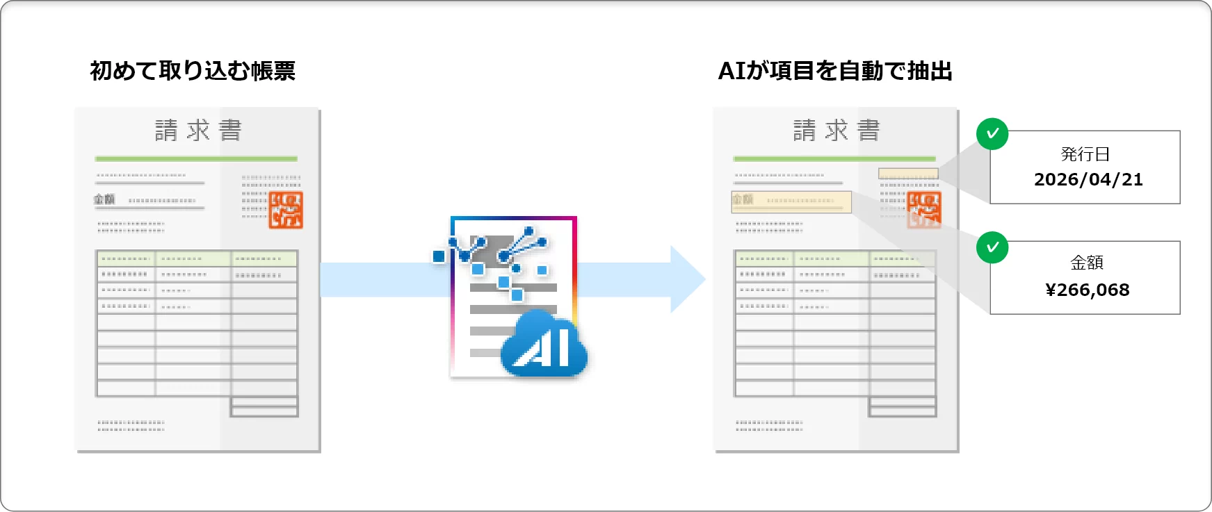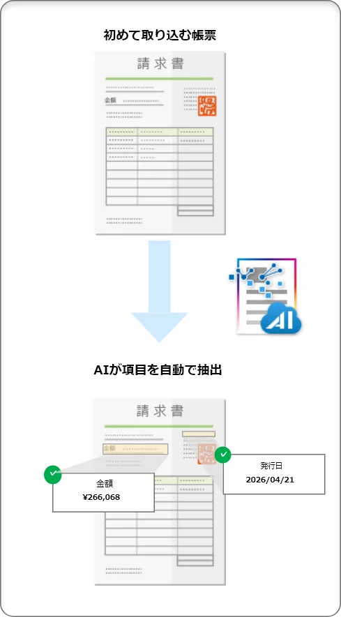 AIが帳票の種類を判別し、必要な項目を自動で抽出してデータ化することが可能です。