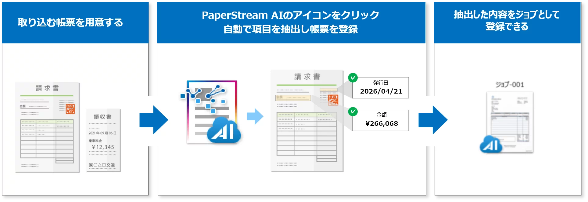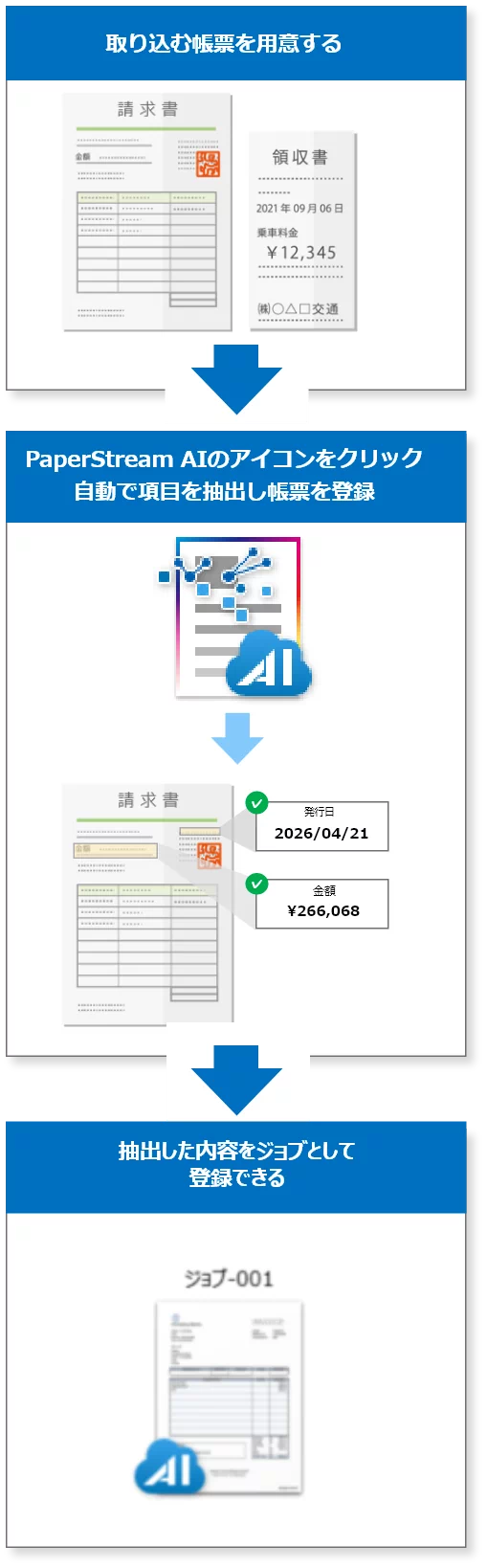 帳票を読み取るとAIが自動で項目を抽出するため、初めて扱う帳票でも簡単にジョブを作るとができます。
