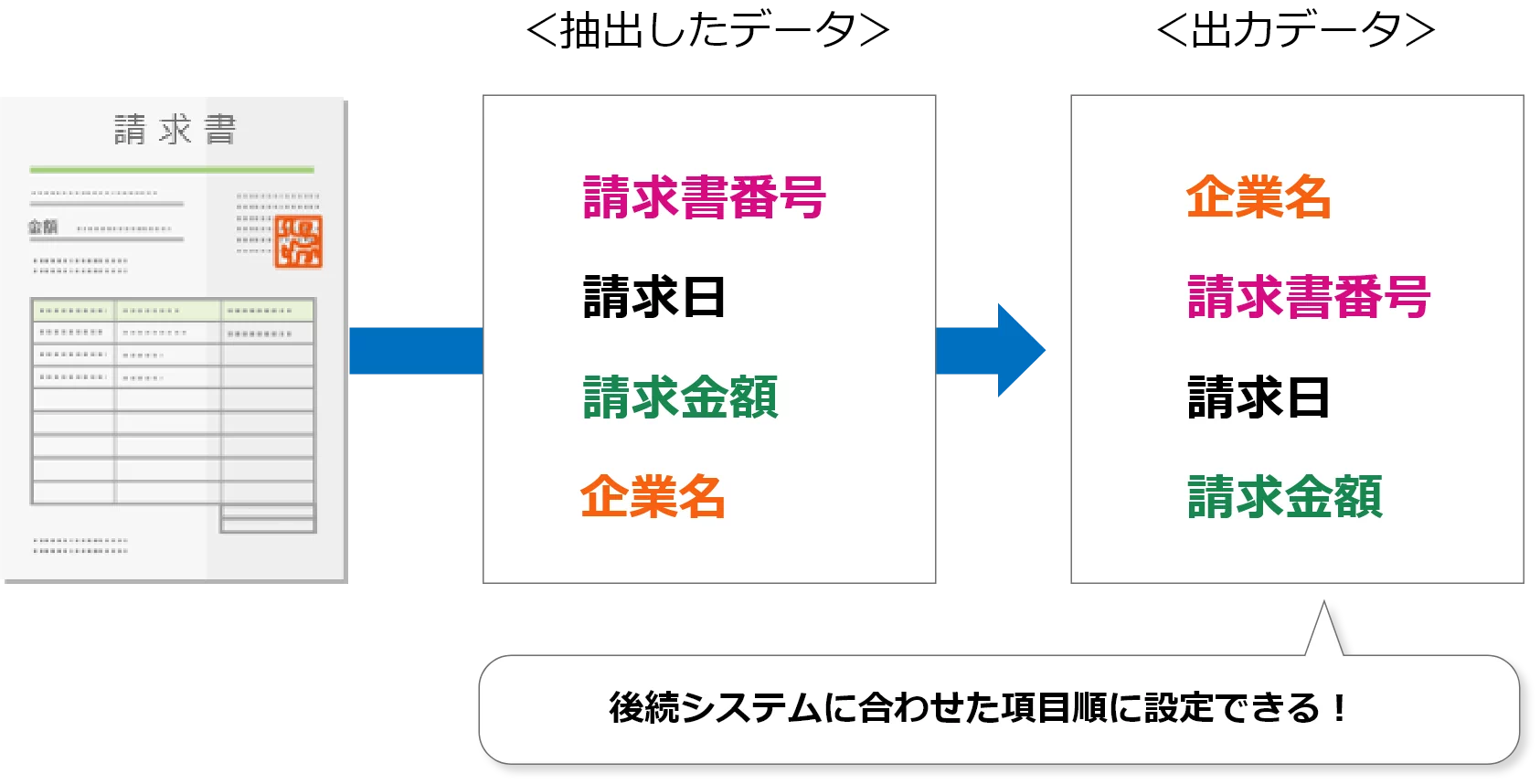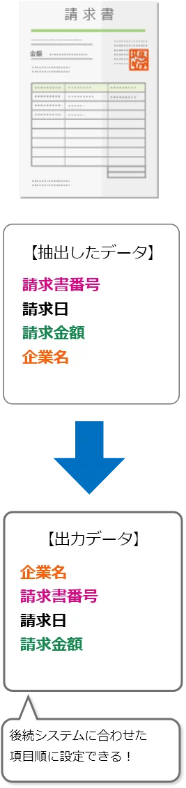 抽出した項目の順番を並び替えることができるため、後続システムに合わせて出力内容を調整することが可能です。