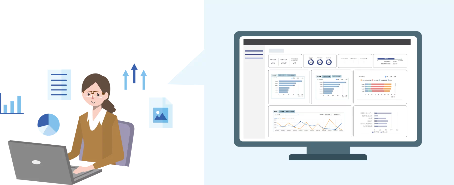 「PaperStream AI」では、ダッシュボード機能により、処理枚数やジョブ別の読取状況に加え、
