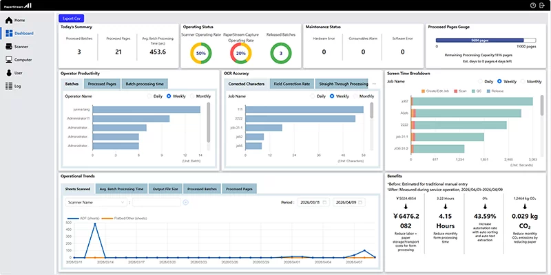 PaperStream AI goes beyond automation by providing clear visibility into document operations. With a centralized dashboard, organizations can optimize performance, identify bottlenecks, and continuously improve workflows.