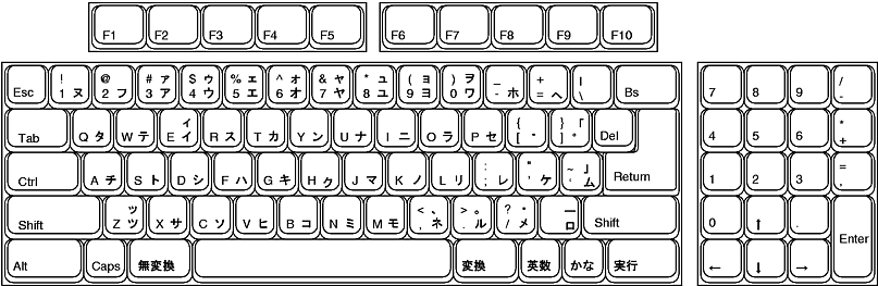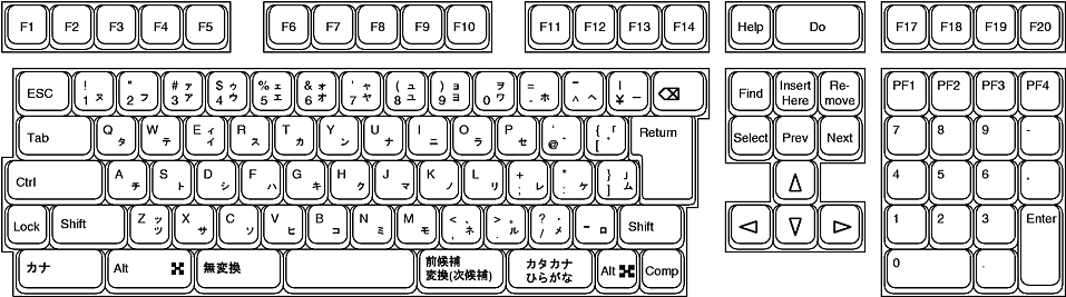 | [Sun Type1 keyboard] 配列は、VT100と同じである。 大阪大学)齊藤先生よりご提供いただきました。 |