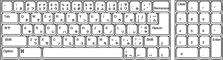 | [Apple Macintosh M0110AJ keyboard] 初代 Macintosh日本語キーボード。英語版の、「CAPLOCK」キーを「カナ」キーに 割り当てている。 |