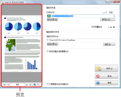 在[Scan to Picture Folder]窗口,可以更改文件名或是目的地文件夹,以及指定是否将扫描图像保存到在[保存图像的文件夹]上指定的文件夹。