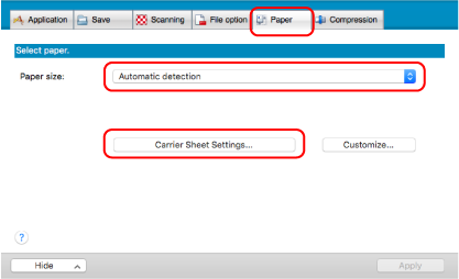 - In the [Paper] tab, select [Automatic detection] in [Paper size], and then click the [Carrier Sheet Settings] button.