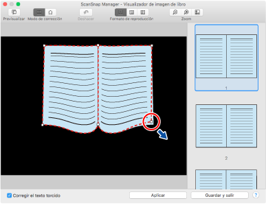 Si el contorno del libro no está alineado con la forma del libro en la imagen digitalizada, arrastre las partes superior e inferior del contorno para corregir cada posición.