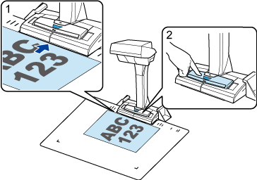 - 將背景取紙分離墊與文件朝 ScanSnap 放置,使其接觸 ScanSnap (1) 然後按下 [Scan] 按鈕 (2) 以開始掃描。