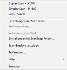 Wenn der SV600 und ein iX1600, iX1500, iX1400, iX1300, iX500, iX100, S1300i oder S1100i mit einem Computer verbunden sind, werden im Kontextmenü Elemente der entsprechenden ScanSnap-Modelle angezeigt.