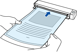 - Insira a parte com o padrão preto e branco diretamente na seção de alimentação do ScanSnap, com o lado frontal da folha de Transporte para cima.