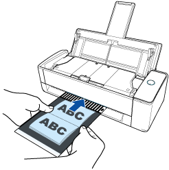 Rivolgere il lato a fronte del Trasporto fogli libretto verso l'alto e inserire la parte con il motivo in bianco e nero direttamente nell'alimentatore manuale di ScanSnap.