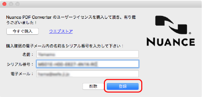 シリアル番号を入力する画面で、名前、Nuance Power PDF Standard / Nuance PDF Converter for Mac ライセンス証に貼られているシリアル番号、およびメールアドレスを入力し、[登録]ボタンをクリックします。