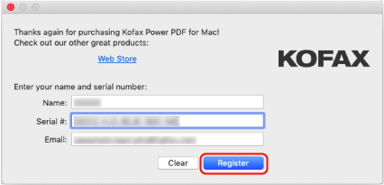 在輸入序號的視窗中,請輸入您的名字、Kofax Power PDF Standard/Kofax Power PDF Standard for Mac 的授權憑證上的序號,以及您的電子郵件地址,然後按 [Register] 按鈕。
