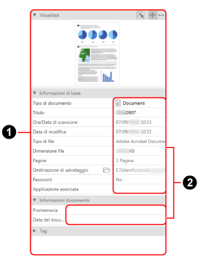 Mostra le informazioni di base del record dati contenuto selezionato come titolo, tipo di documento, data e ora in cui è stata eseguita una scansione.