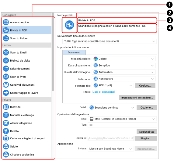 Visualizzato quando è selezionato [Mac (Gestisci in ScanSnap Home)] o [Mac (Scansione verso file)] per [Tipo] in [Opzioni modalità gestione].