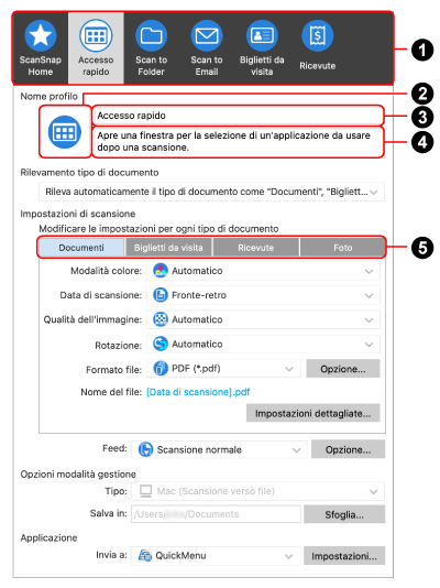 Visualizzato quando è selezionato [Mac (Gestisci in ScanSnap Home)] o [Mac (Scansione verso file)] per [Tipo] in [Opzioni modalità gestione].