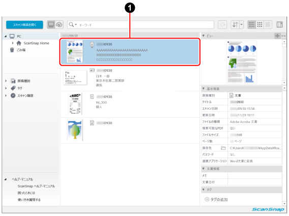 ScanSnapでスキャンした原稿のコンテンツは、ScanSnap Homeのメイン画面のコンテンツリストビューで確認できます。