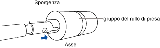 Inserire la sporgenza dell'asse nella sede del gruppo del rullo di presa.