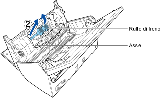 Sollevare il rullo di freno per togliere il lato destro dell'asse ed estrarre l'asse dal foro a sinistra.