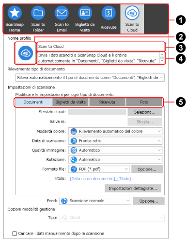 In questa sezione vengono spiegate le voci di impostazione per un profilo collegato a un servizio cloud usando ScanSnap Cloud. Una voce di impostazione non supportata da un servizio cloud con cui è stato stabilito un collegamento non viene visualizzata o non può essere selezionata.