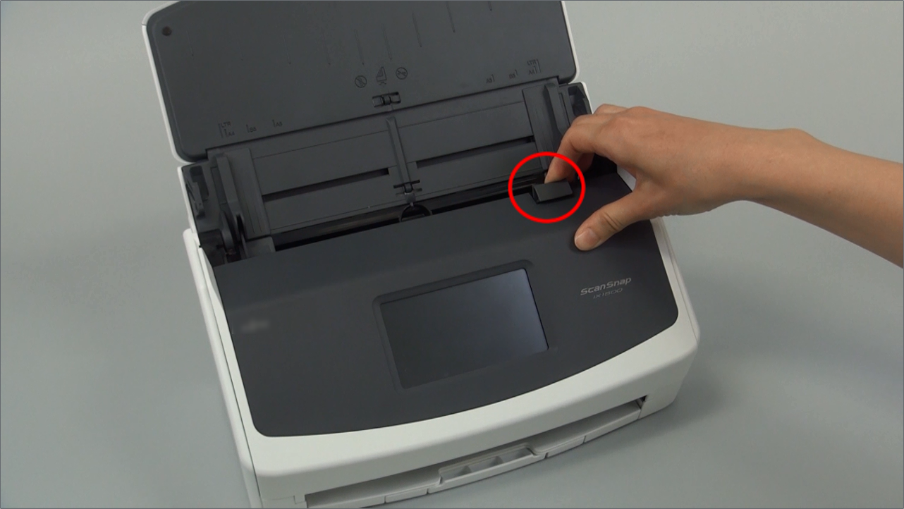 إذا كان من الصعب تنظيف بكرة الإخراج، فحاول تنظيفها من الجزء الخلفي من ScanSnap، بينما تبقي الغطاء العلوي مفتوحًا بعض الشيء.