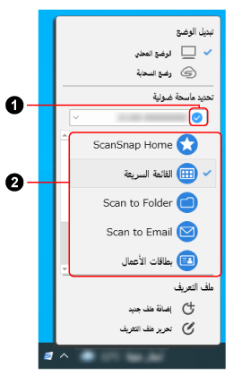 يتم عرض هذه القائمة عندما تنقر بالزر الأيسر فوق أيقونة ScanSnap Home.