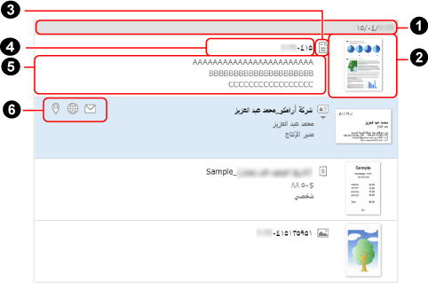 يُظهر عرض قائمة تسجيل بيانات المحتوى على النافذة الرئيسية قائمة تسجيلات بيانات المحتوى التي تتم إدارتها باستخدام ScanSnap Home.