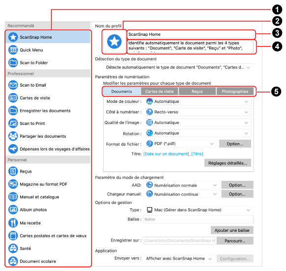 Lorsque [Mac (Gérer dans ScanSnap Home)] ou [Mac (Numériser vers un fichier)] est sélectionné pour [Type] dans [Options de gestion]