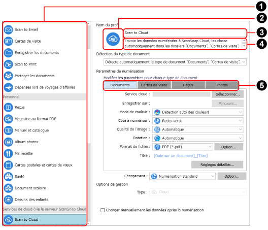 ) Lorsque vous sélectionnez [Détecte automatiquement le type de document "Documents", "Cartes de visite", "Reçus" ou "Photos" et numérise le document avec les paramètres de numérisation appropriés] pour [Détection du type de document], vous pouvez sélectionner l'onglet correspondant à un type de document. Passez d'un onglet à l'autre pour spécifier les paramètres de numérisation pour chaque type de document.