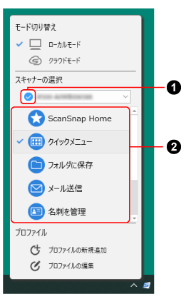 また、ScanSnap Homeのアイコンをクリックして表示されるメニューで、使用するScanSnapやプロファイルを切り替えたり、プロファイルを追加したり、プロファイルの設定を変更したりできます。