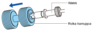 Unieś rolkę hamującą z prawej strony wałka, a następnie wyciągnij wałek z otworu z lewej strony.