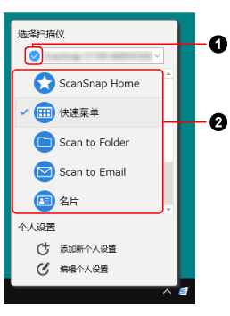 此外,还可以在单击ScanSnap Home图标后出现的菜单里切换预期要使用的 ScanSnap或个人设置、添加个人设置或修改个人设置的设置。