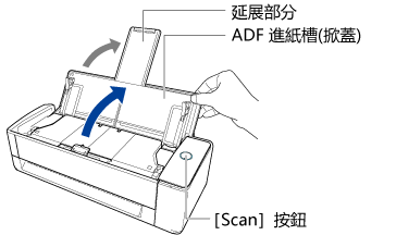 完全打開 ADF 進紙槽 (掀蓋) 而讓 [Scan] 按鈕亮起藍燈。