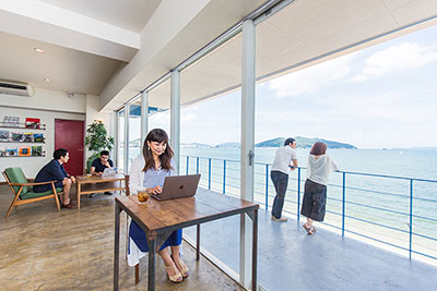 福岡市西区にあり、最寄りの今宿駅から徒歩5分程。目の前に広がる青い海と潮騒を楽しみながら仕事ができる、ロケーション抜群のシェアオフィスです。シェアオフィスの他、宿泊施設も併設しており、移動時間を気にせず快適に過ごせます。