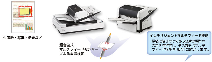 写真・付箋等が貼付された原稿のマルチフィード誤検出を防止。読み取り前の原稿処理作業を簡略化し、読み取り作業を効率化できます。