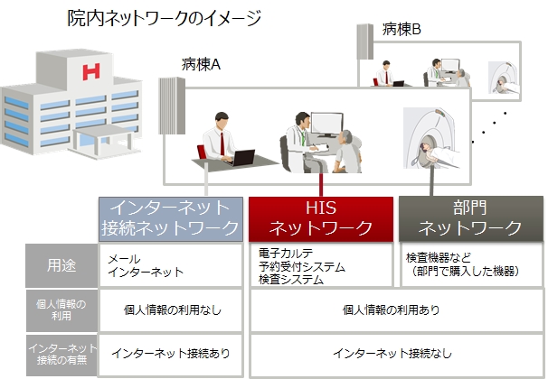病院のネットワーク構成は、「インターネットに接続されているネットワーク」「インターネットから分離しているネットワーク」の2つに分けられています。各病院では、ネットワークの利用目的や取り扱う情報などの観点で、それらのネットワークをさらに分けた構成にしている場合が多いようです。ここでは3つのネットワークに分けて運用している場合を例に説明します。