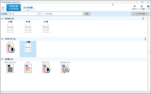 「PaperStream Capture Pro / Capture Pro Premium」では、ジョブのグループ化が可能になりました。BPOなど集中入力業務を行う現場において、大量のジョブを作成して運用している際に、案件名や文書の種類などの単位でジョブをグループ化することで、目的のジョブを素早く見つけることができ、スキャン業務をよりスムーズに行うことが可能です。また、ジョブの選択ミスを軽減し、作業の手戻りを防ぐことができます。