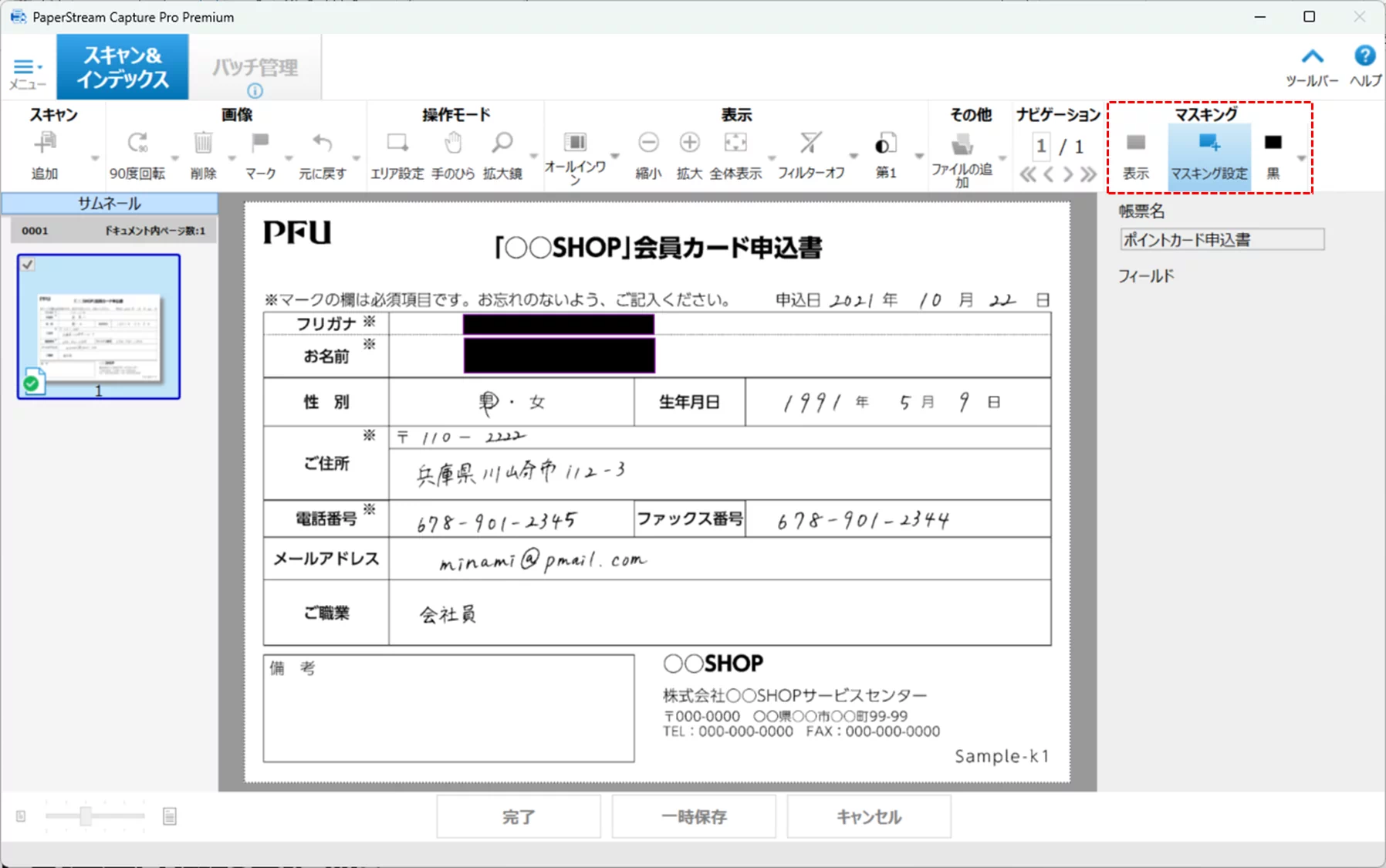 「PaperStream Capture Pro / Capture Pro Premium」に搭載されている「マスキング」機能(注1)は、事前にマスキングする部分をジョブに設定しておくことで、画像の特定部分を隠して画像化することができますが、今回のアップデートにより、スキャン後に表示される確認画面でもマスキングの追加指定が可能になりました。例えば、帳票の一部に追加でマスキングが必要な場合や、書類ごとにマスキングが必要な箇所が異なる場合でも、スキャン後にその場で該当部分を指定してマスキングすることが可能です。これにより、オペレーターが状況に応じて柔軟に対応することができます。