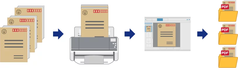 例えば、スキャンを大量に行うBPO企業や金融機関などで封書をデータ化する際も、封筒を仕切り紙として中身の書類を1セットで自動的に仕分けできるようになるため、後から手作業でファイルを分割したり、別々にスキャンした画像ファイルをマージしたりする手間を省くことができます。