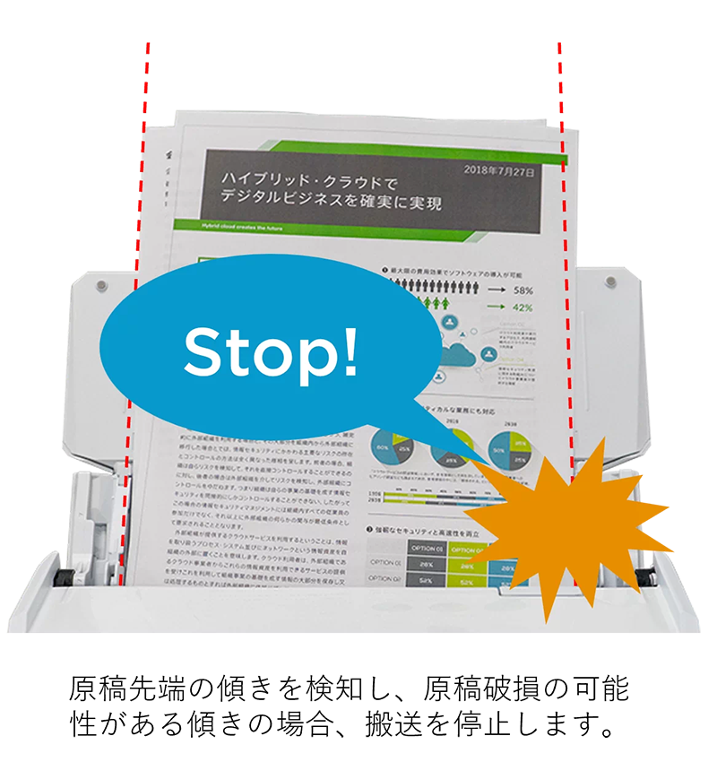 - 傾き検知機能により、斜めにセットしてしまった場合も、原稿が破損する前に用紙搬送を停止し、大切な原稿を保護します