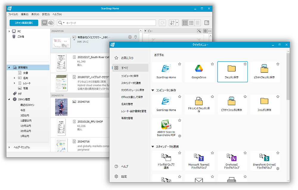 スキャン機能と、データの管理・活用を一つにまとめた、専用ソフトウェア「ScanSnap Home」(PC版)で、ストレスのないデータ管理を行うことができます。また、スキャン後に表示されるクイックメニューから保存先や送信先を選択でき、Microsoft Teams、SharePoint、OneNote、Notion、iCloudへの連携や、ScanSnap Cloudと連携しているクラウドサービスへの保存が可能です。(注2, 注3)
