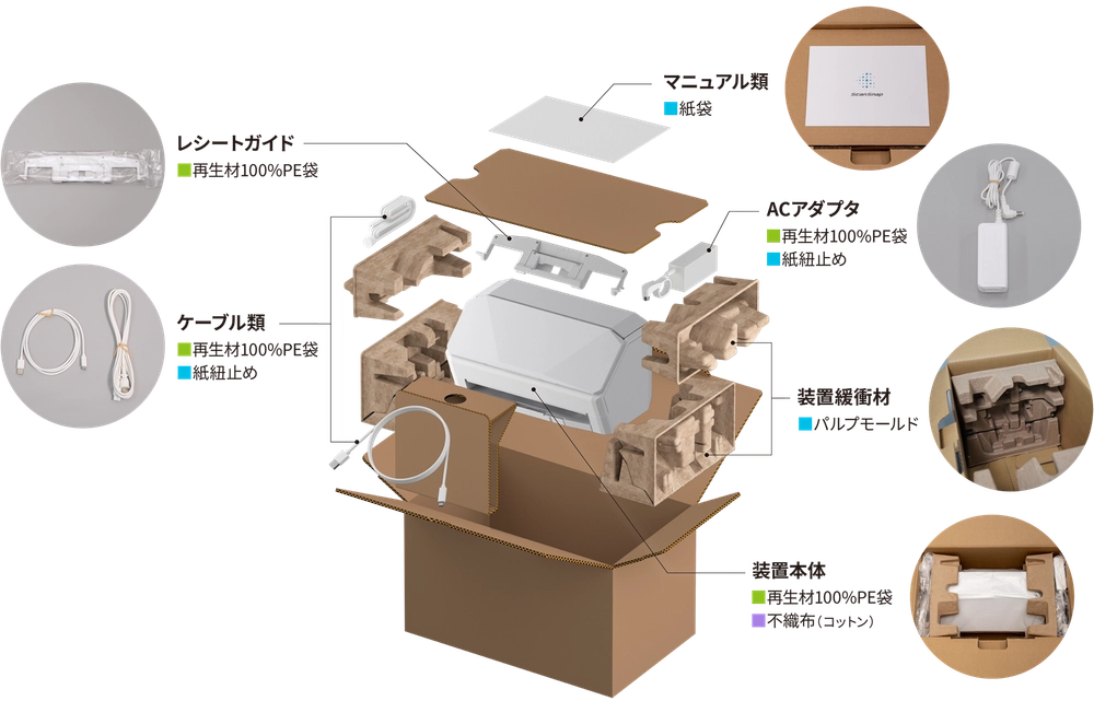 スキャナー本体は、リサイクルプラスチック素材を25%使用し(注4)、梱包材にも化石資源由来のバージンプラスチックを使用せず、環境に配慮しています。(注5)